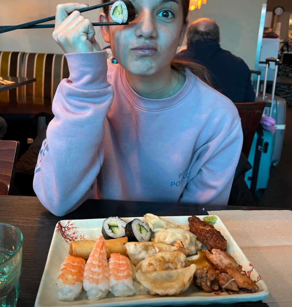 Myös tytär on tottunut syömään melko kansainvälisesti ja hänen herkkuruokaansa ovat tällä hetkellä sushi, gyozat ja muut aasialaiasen keittiön antimet.