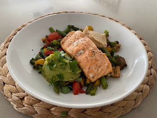 Kotona meillä syödään kuitenkin aika usein ihan sellaista perusruokaa, joka ei ehkä ole mistään kotoisin 🙂 Eli yleensä paljon vihanneksia, sen lisäksi proteiinia riitävästi & vaihtelevasti, terveellisiä rasvoja sekä tarvittaessa hyviä hiilihydraatteja. Toki kotiruuassakin on usein vaikutteita eri puolilta maailmaa eli meillä syödään myös kotona aasialaista, intialaista, meksikolaista, perulaista, italialaista jne. Mutta esim. omat lounasateriani näyttävät usein tältä…
