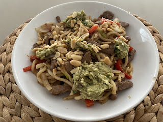 Puolison lounaat ovat muuten samanlaisia mutta silloin kun hän lähtee iltavuoroon eli menee töihin klo 15 ja pääsee kotiin klo 22 aikaan niin pyrin tekemään hänelle lounaan, jossa on lisäksi hiilihydraatteja – yleensä quinoaa tai pastaa, joskus riisiä. Hän ei nimittäin ehdi yleensä töissä syömään mitään ja siksi lounaan pitää olla sellainen että siitä riittää energiaa koko illaksi.