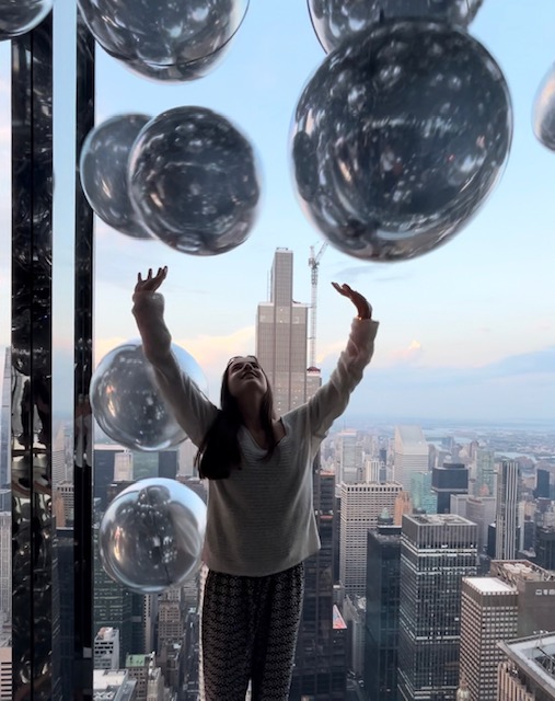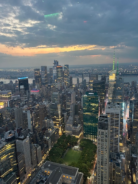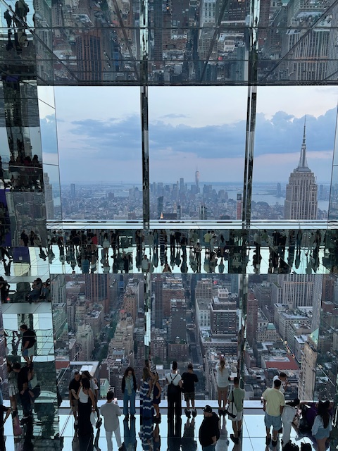 Illalla suuntasimme yhteen reissun kohokohdista eli Summit One Vanderbilt-näköalapaikalle. Liput olimme varanneet jo useita päiviä ennakkoon koska paikka on erittäin suosittu ja halusimme päästä sinne nimenomaan auringonlaskun aikaan. Näin näkisimme maisemat sekä päivänvalossa että yövalaistuksessa. Tuo ajankohta on tietysti kaikista suosituin joten liput myydään ajoissa ja lisäksi auringonlaskun aikaan pitää maksaa 10 USD:n lisämaksu. Maksoimme siis lipuista 53 USD / henkilö mutta tuo oli ehdottomasti hintansa arvoinen vierailu.