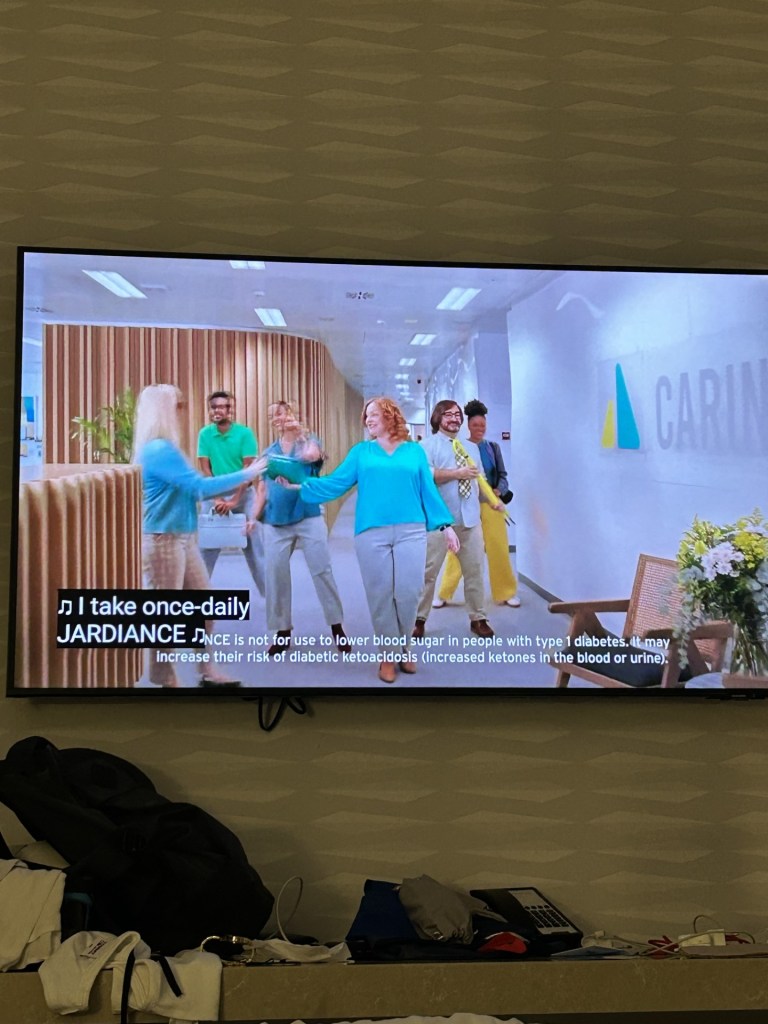 Esim. tässä iloisessa mainoksessa mainostettiin musiikin ja tanssin kera Jardiance-lääkettä, joka on 2.tyypin diabeteksen hoitoon tarkoitettu lääke.