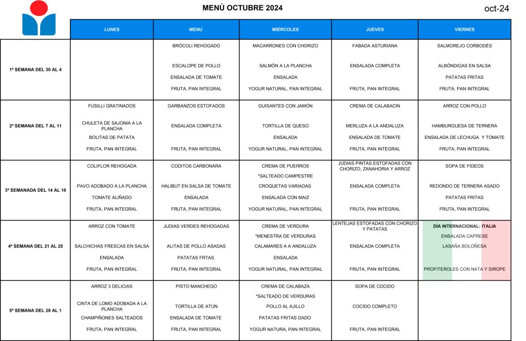 Kouluissa tarjottava ruoka nykyään kuitenkin pääasiassa terveellistä ja varsin monipuolista. Ruokalistat eivät sisällä lasten herkkuruokia vaan ruokalistojen suunnittelusta vastaavat ravitsemusalan ammattilaiset. Tästä syystä ruokalistoilla ei näy kauheasti herkkuja vaan hyvin perinteisiä espanjalaisia ruokia ja ne noudattavat pitkälti paikallisia ravintosuosituksia.