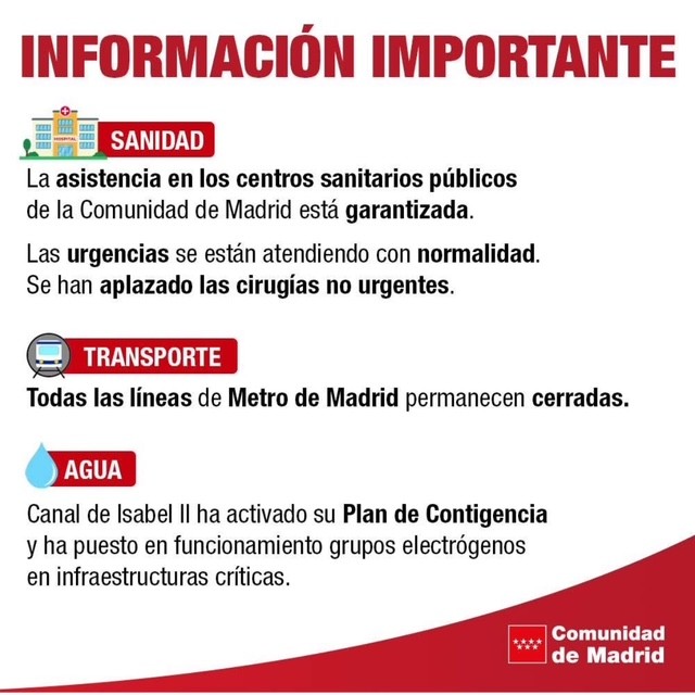 Metrot ja junat jäivät raiteilleen. Monet joutuivat odottamaan junissa, ilman ilmastointia, tuntikausia. Mutta suurin osa saatiin kuitenkin evakoitua iltapäivän / illan aikana. Myös tiet olivat täysin tukossa koska kaikki lähtivät töistä takaisin kotiin ja noutamaan lapsia kouluista samaan aikaa. Liikenne kaupungissa oli normaalia hitaampaa koska liikennevalot eivät myöskään toimineet. Madridin kaltaisessa miljoonakaupungissa jo pelkästään tuollaisella saadaan isot ruuhkat aikaiseksi. Ja koska metrot eivät toimineet niin ihmiset olivat aika pulassa – bussit sentään kulkivat vaikkakin ruuhkista johtuen tietysti normaalia hitaammin.
