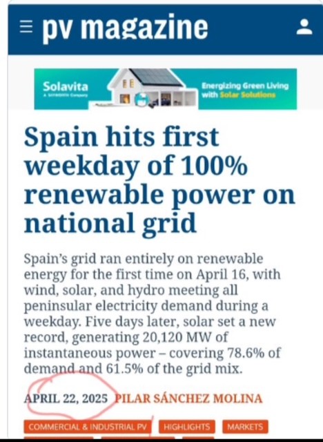 Juurihan pari päivää sitten juhlallisesti mainostettiin sitä että ensimmäistä kertaa historiassa Espanjan sähköverkko toimi kokonaan uusiutuvalla energialla. Eilinen superaurinkoinen päivä mahdollisti huikean määrän aurinkoenergiaa, johon ehkä sähköverkko ei ollut valmistautunut, ja sen seurauksena ehkä koko homma kaatui. Ehkä syy oli muualla, sitä emme tiedä. Mutta ilmeisesti jo useampana päivänä on ollut tilanne päällä eli verkossa on ollut ylituotantoa ja eilen sitten tapahtui se mitä monikaan ei uskonut mahdolliseksi. Koko sähköverkko kaatui kertalaakista ensimmäsitä kertaa historiassa.