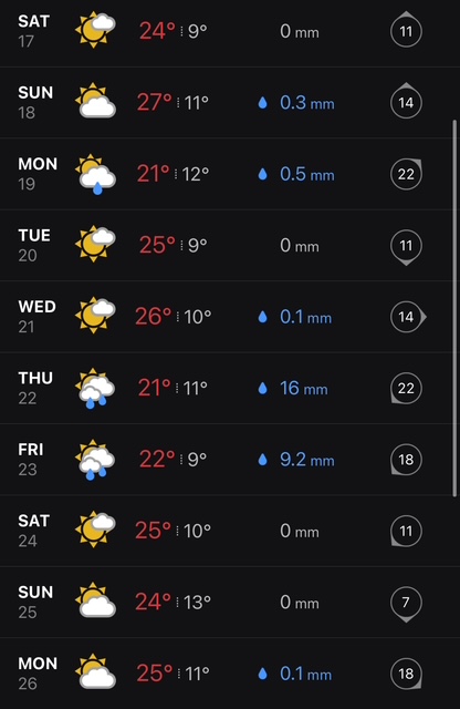 Kesällä lämpötilat kohoavat yleensä vasta 11 aikaan eli jos on liikkeellä heti aamusella niin pystyy nauttimaan päivän viileimmästä hetkestä. Vuorokauden viilein hetki on yleensä aamulla n. klo 7 aikaan.