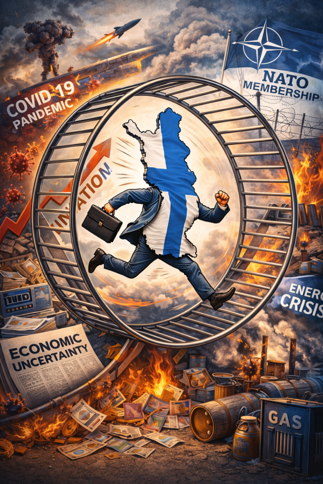 Ehkä suurin ero viiden vuoden takaiseen on kuitenkin tunne. Suomi tuntui ennen paikalta, jossa tulevaisuus oli avoin mutta hallittava – sellaiselta, jossa epävarmuus kuului asiaan, mutta sitä ei pidetty uhkana. Nyt Suomi näyttäytyy paikalta, jossa tulevaisuus on avoin mutta uhkaava. Ikään kuin jokin kriisi olisi pidettävä jatkuvasti käynnissä, jotta ihmiset pysyisivät valppaina, kuuliaisina ja valmiina reagoimaan. Kriisistä on tullut rytmi, ei poikkeus.