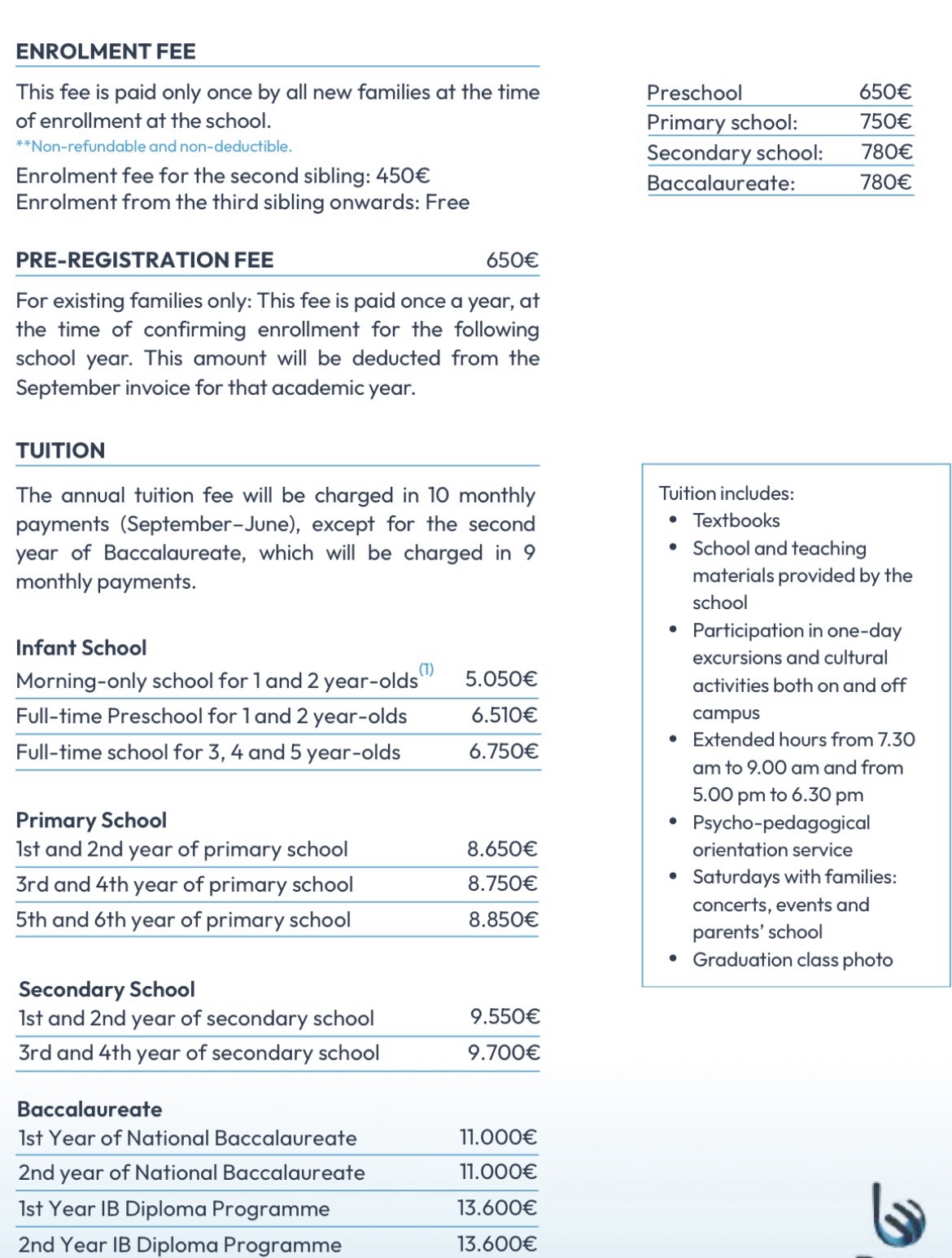 Kirjautumismaksu on 650 € – tämä siis maksetaan vain kerran. Vuosimaksut ovat esikoulussa eli 3-5 vuotiailla 6750€, alakoulussa 5050-6750 €, yläkoulussa 9550-9700 € ja lukiossa 11 000 – 13 600 €. Näiden lisäksi maksetaan ruokailusta 2500 € / vuosi, vakuutuksesta 110 € sekä mahdollisista kuljetuksista.