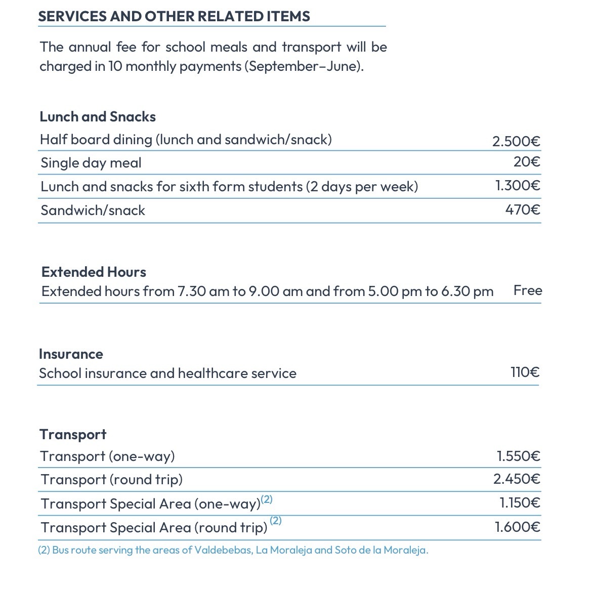 Vuosimaksut alkavat noin 9 000 eurosta ja nousevat yläluokilla noin 20 000–24 000 euroon. Lisäkustannuksia tulee myös kouluruokailusta, kuljetuksista, materiaaleista sekä harrastus- ja kerhotoiminnasta.
